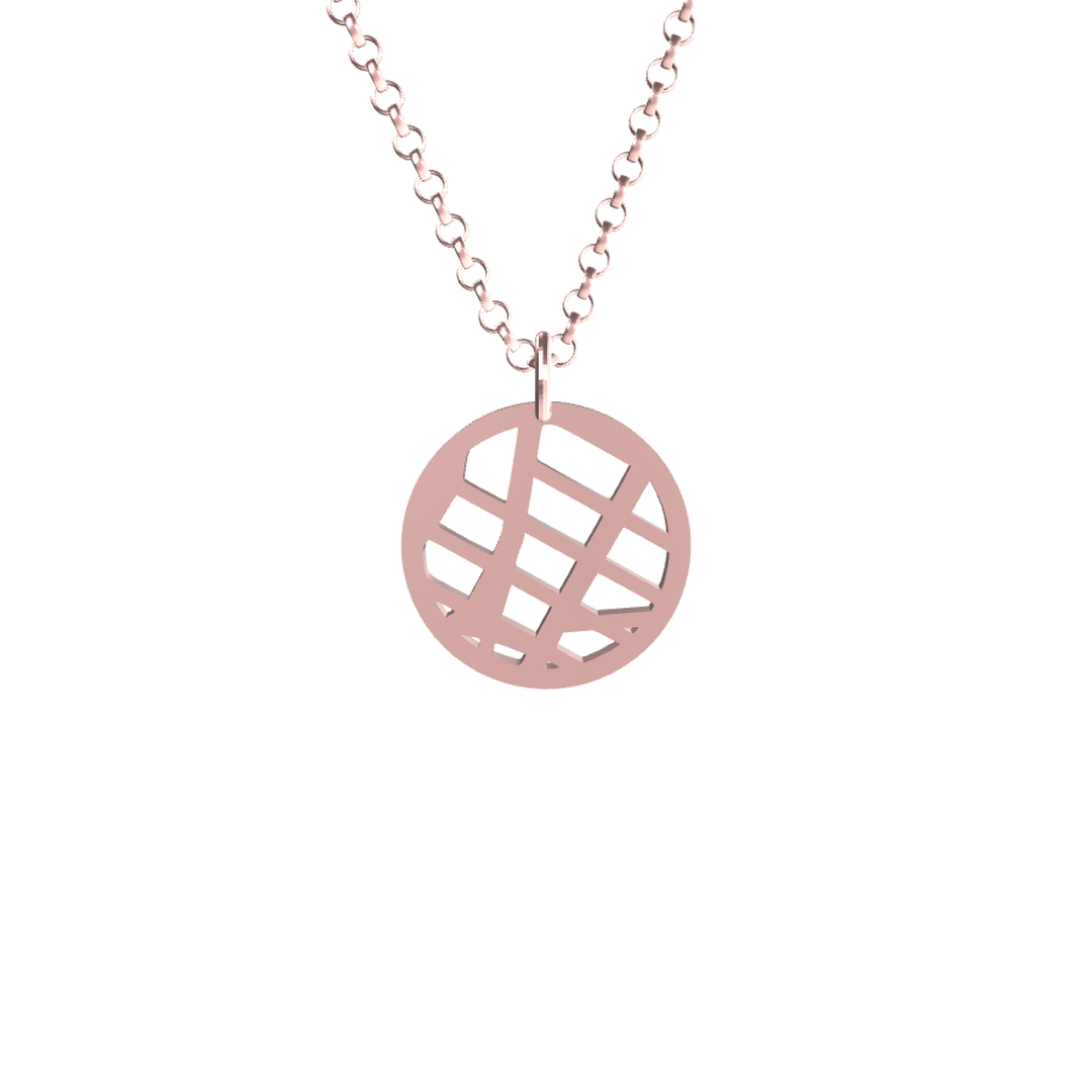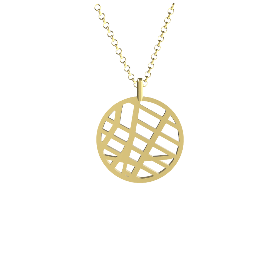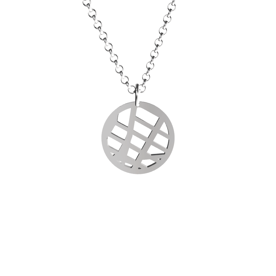 Precision-cast custom map pendant in premium metal, hand-finished. 16 mm (dime size) on a refined rolo chain — 18″ standard, 28″ in Sterling Silver. Made in the USA.