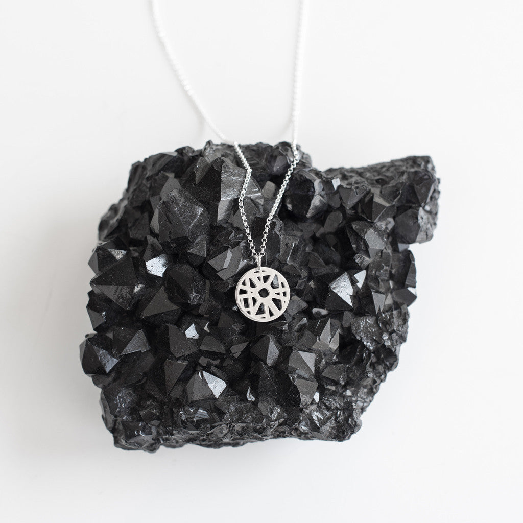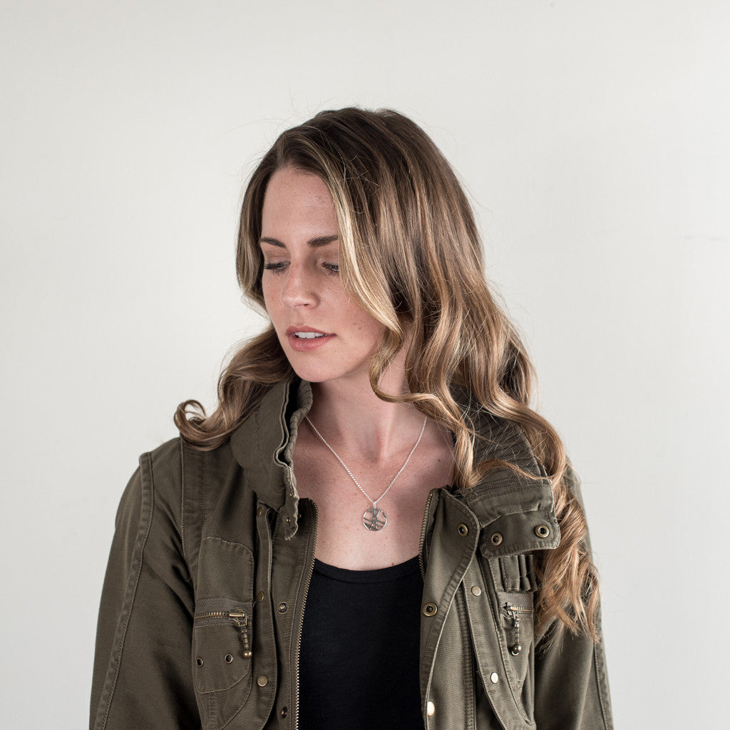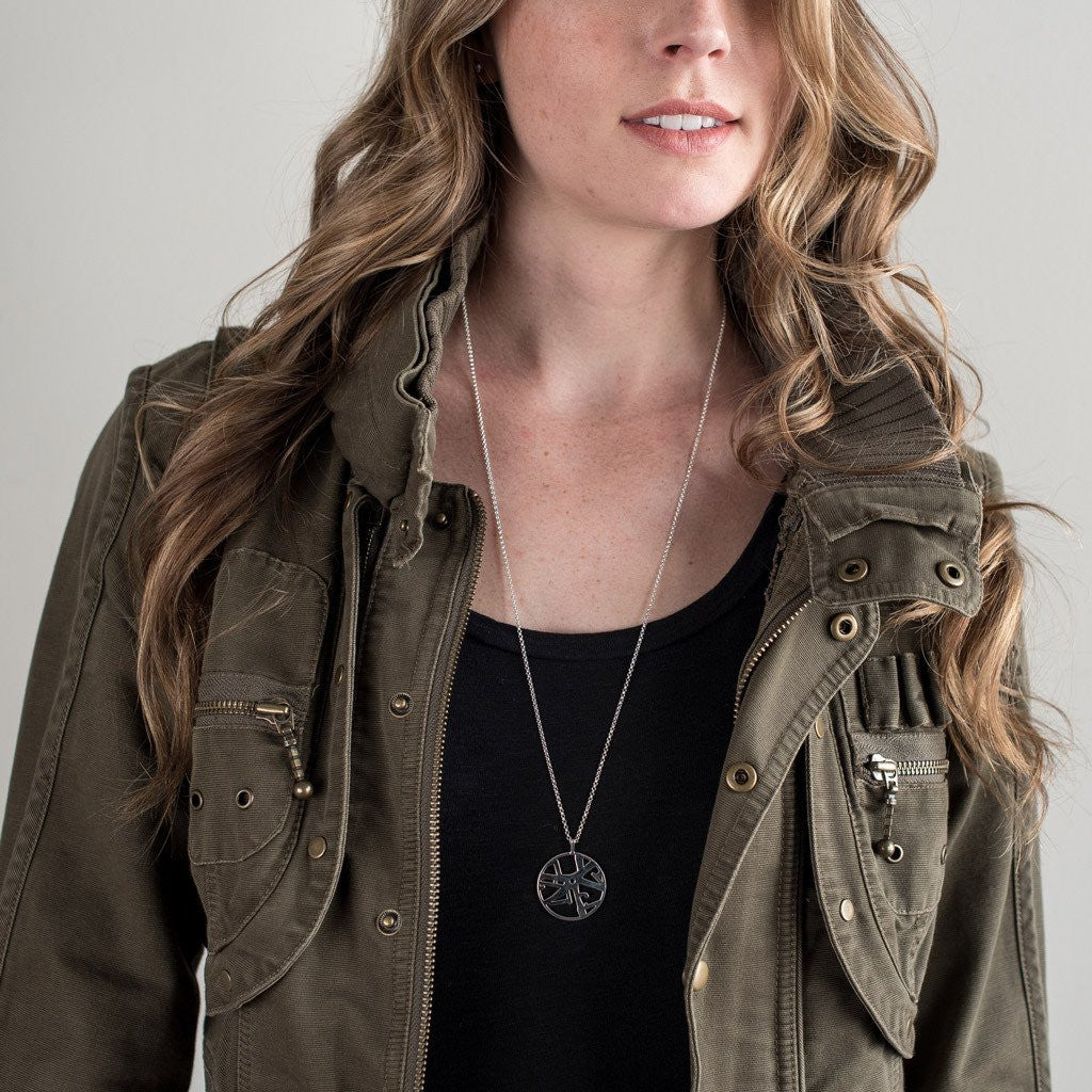 Precision-cast custom map pendant in premium metal, hand-finished. 16 mm (dime size) on a refined rolo chain — 18″ standard, 28″ in Sterling Silver. Made in the USA.